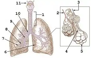 У птахів органи дихання мають особливу будову. У них, як і у рептилій, немає діафрагми. Трахея ділиться на 2 бронхи, що проходять крізь легені в повітряні мішки. Легені невеликі і зрощені з ребрами. Повітря з легенів надходить через розгалуження бронхів, бронхіол і повітряні капіляри в повітряні мішки. Невеликі повітряні мішки розташовані в грудній, а великі — в черевній порожнині. У всіх повітряних мішків є відростки, деякі з них проникають в трубчасті довгі кістки кінцівок. При вдиху відбувається значне збільшення обсягу грудної клітки в вертикальному напрямку за рахунок збільшення кута між частинами ребер. Газообмін здійснюється в легенях і в повітряних капілярах (рясно забезпечених кровоносними капілярами), крізь які повітря проходить під час вдиху і видиху двічі (в повітряні мішки і назад). Повітряні мішки сприяють підтримці тіла птаха в польоті, а також охолодженню тіла і збереженню життя за тривалої відсутності дихання. У водоплавних птахів вони зменшують щільність тіла, внаслідок чого птахи мало занурюються у воду[1][2].