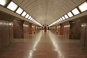 В оздоблені колійних стін і станційного залу використано червоний мармур. На торцевій стіні залу і над входом на ескалатор розміщені литі барельєфи на тему оборони Москви в 1941 (скульптор Ф. Д. Фівейський). Підлога викладена червоним і чорним гранітом.