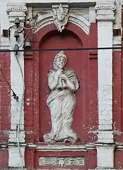 Площина розділена міжповерховими гуртами. На верхніх поверхах фасад прикрашений лізенами. Вікна прямокутні. Два верхні аркові вікна на розкріповках оздоблені замковими каменями з ліпленими головами янголів[1].