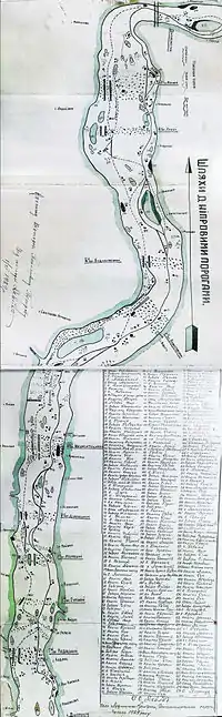 Лоханський поріг. Знаходився за 1,33 км нижче кінця Сурського порогу, навпроти сучасного гранітного кар'єру, що розташований на південь від правобережного села Волоське Дніпровського району Дніпропетровської області[64]. Поряд з порогом у руслі Дніпра, ближче до лівого берега річки, знаходилися три невеликі острівці — Кулики, Лоханський та Скелястий. За даними Д. О. Свіренка довжина порогу дорівнювала 150 м, падіння води — 1,12 м[67]. Поріг складався з трьох лав: Куликівської, Плоської та Черепашиної[68].