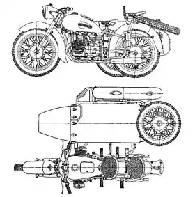 Рама мотоцикла трубчаста, закритого типу. Передня вилка телескопічна (з 1963 року) з пружинними масляними амортизаторами. Задня підвіска маятникова з телескопічними амортизаторами. Привід на заднє колесо через карданний вал. Зазвичай, на боковому причепі встановлювалось запасне колесо.