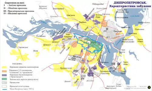 - Дніпропетровська забудова (1920-80-ті): Західний, Червоний Камінь (захід Нового Кодаку), Покровський (ж/м Комунар, сел. Діївка), Парус (частина сел. Діївки), Старий Шлях, Фрунзе (проспект Івана Мазепи, Чечелівка), вулиця Робітнича, 12 квартал, Корея (ж/м Будівельник), сел. Мирне, проспект Гагаріна (давнє — Міські Дачі, радянське — Вузівський), Підстанція (Дачі, 1 Травня), Тополя, Сокіл, Перемога, Мандриківка, Ломівка, Лівобережний, Кротова, Боржом, вулиця Калинова (Султанівка), Калинівський, Слобожанський проспект, просп. Петра Калнишевського, Сонячний, Вузол (Північний і Південний), Вінниця, Придніпровськ.