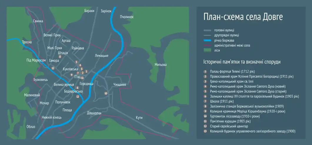 В Довгому нараховується 45 вулиць та 1947 дворогосподарств.