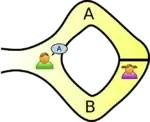 Спочатку Тарас очікує зовні печери, Оксана входить. Вони позначили лівий та правий проходи як A і B. Тоді Тарас заходить у печеру і вигукує назву проходу, яким має вийти Оксана. Якщо вона справді знає магічне слово, то для неї легко вийти будь-яким проходом. Зауважте, Тарас не знає, яким саме проходом Оксана ввійшла.