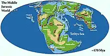 У епоху Середньої юри Пангея почала відокремлюватися на Лавразію та Гондвану, і утворився Атлантичний океан. Східна Лавразія була тектонічно активною, оскільки Кіммерійська плита продовжувала стикатися з південним узбережжям Лавразії, повністю закриваючи океан Палеотетіс. Зона субдукції на узбережжі західної Північної Америки продовжувала створювати Прадавні Скелясті гори.
