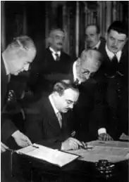 ![]() Посол СРСР Валеріан Довгалевський зачитує текст Договору прем'єр-міністрові Франції Едуарду Ерріо | |