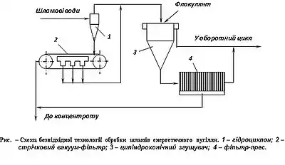 Розроблена безвідхідна технологія обробки шламів на фабриках, що збагачують енергетичне вугілля (рис. ). Схемою передбачається класифікація шламу по крупності 0,1 – 0,2 мм в гідроциклонах. Крупний шлам зневоднюється на стрічкових вакуум-фільтрах і присаджується до концентрату. Злив гідроциклонів сумісно з фільтратом стрічкових вакуум-фільтрів направляється на глибоке прояснення із застосуванням флокулянтів у циліндроконічних згущувачах, які забезпечують також висококонцентроване згущення шламу. Це дозволяє застосовувати фільтр-преси для зневоднення тонких шламів. Осад фільтр-пресів також присаджується до концентрату. Чистий злив циліндроконічних згущувачів і фільтрат фільтр-пресів повертаються у оборотний цикл фабрики.