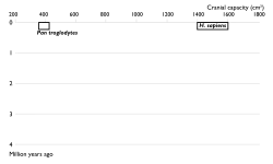 | Прогрес у вивченні еволюції людини. Збільшення числа відомих видів гомінін у часі. кожен вид зображений у вигляди прямокутника, який показує межі, в який в яких варіював обсяг черепа, і місце виду в палеонтологічному літописі. Видно поступове заповнення проміжків між видами. | |
