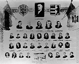 По центру: Президент Карпатської України о. Августин Волошин; Перший ряд зліва направо: Микола Долинай, Юлій Бращайко, Юліян Ревай, Августин Штефан, Степан Клочурак; Другий ряд: Федір Ревай, Степан Росоха, Леонід Романюк, Августин Дутка, Михайло Тулик, Дмитро Німчук, Михайло Бращайко, Іван Грига, Микола Мандзюк; Третій ряд: Володимир Комаринський, Микола Різдорфер, Антон-Ернест Олдофреді, Мілош Дрбал, Григорій Мойш, Михайло Марущак, Кирило Феделеш, Василь Климпуш, о. Юрій Станинець; Четвертий ряд: Василь Щобей, Іван Ігнатко, Юрій Пазуханич, Іван Перевузник, Адальберт Довбак, Петро Попович, Іван Качала, Василь Лацанич
