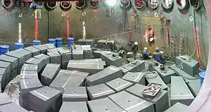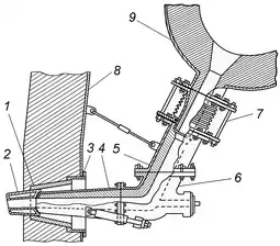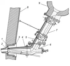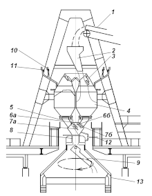 Широкого застосування набули також безконусові завантажувальні пристрої (БЗП) лотікового типу. Безконусовий завантажувальний пристрій спрощує необхідне розподілення шихтових матеріалів на колошнику.[36] Лотік обертається як по окружності, так і переміщається у радіальному напрямку. Визначенням відстані від стін шихту можна зсипати у різні зони по радіусу колошника — ближче до стінок, у проміжну чи осьову зони. Лотіковий засипний пристрій може працювати як зі станціями (фіксованими положеннями лотіка при зсипані однієї подачі шихти), так і у режимі завантаження з одночасним поворотом і нахилом лотіка. У цьому випадку виходить досить рівномірний шар матеріалів по радіусу печі.[37]