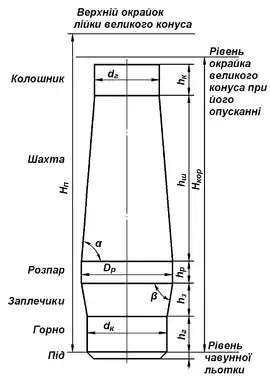 - висота горна — відстань від осі чавунної льотки до нижньої окрайки заплечиків.