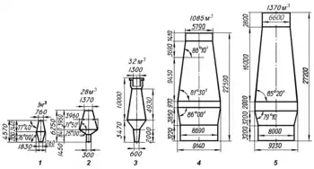 - корисний об'єм — об'єм, заповнений шихтовими матеріалами і продуктами плавки. Об'єм від осі чавунної льотки до пругу (окрайка) великого конусу у відкритому положенні. У СРСР будувалися типові́ доменні печі об'ємом 930, 1033, 1386, 1513, 1719, 2002, 2300, 2700, 3000, 3200, 5000, 5500 м³.[34] Окремі з них будувалися в Україні.