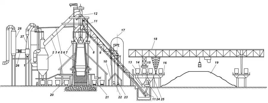 Доменний цех металургійного заводу являє собою комплекс споруд: доменних печей, повітронагрівачів, газоочисників, рудного двору, енергетичного господарства, залізничних шляхів тощо. Сировина і паливо надходять у доменний цех залізничним або водним транспортом, вони вивантажуються у бункери бункерної естакади або на рудний двір. Під бункерами бункерної естакади розташовані вагон-ваги, що встановлені на залізничні рейки й можуть пересуватися вздовж бункерів. Вони дозовано вивантажують шихтові матеріали з бункерів, перевозять їх до скіпової ями і вивантажують у скіпи. Скіпами шихтові матеріали по скіповому підйомнику пересуваються до верхньої частини печі — на колошник. Над колошником печі розташований колошниковий пристрій, до складу якого входять механізми завантаження шихти, відведення доменного газу, а також допоміжні пристрої і механізми. Через засипний апарат матеріали завантажуються у доменну піч. На багатьох доменних печах великого об'єму використовуються не скіпові підйомники, а стрічкові конвеєри. Через колошник по газовідводах з печі відводиться доменний газ, що утворюється в ній внаслідок хімічних процесів. Газ виносить з печі дрібні часточки щойно завантажених матеріалів, тому він спрямовується у систему газоочищення, де звільняється від пилу. До системи газоочищення відносяться пиловловлювач, скрубер, труба Вентурі та дросельна група.