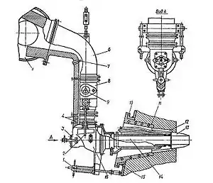 Розподільник шихти складається з обертової лійки, малого конуса зі штангою, обертового корпусу, трибово́ї передачі і приводу. На корпусі розподільника закріплено трибови́й вінець, що перебуває у зчепленні з шестернею, що насаджена на вертикальному валу штибової передачі. Вал приводиться в дію від привода через пару конічних шестерень. Між обертовим корпусом і нерухомим опорним кільцем розподільника є сальникове ущільнення, що облаштоване подвійним сальником, що запобігає виходу газу з міжконусного простору засипного апарату у атмосферу.