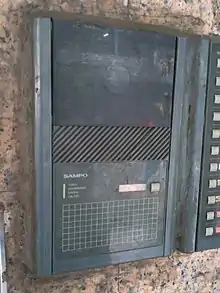 - Замикаючий пристрій. Сучасні домофони зазвичай забезпечують зв'язок з електричним замком,[2] хоча замок не є складовою частиною домофона, а тільки виконує команду відкриття дверей. Можливі варіанти замка: