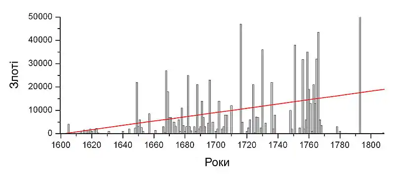 Графік ілюструє динаміку та розміри грошових надань монастирю. На осі абсцис — роки, ординат — злоті. Червона лінія є апроксимацією надань упродовж двох століть, з чого видно, що суми надань з часом збільшувалися. Як видно з графіку, найчастішими були надання у рамках до 5000-6000 злотих. Особливу підтримку пріорат почав отримувати із 1620-1630-х років. Найбільшу за величиною надання і найчастішу підтримку отримував у 1750-1760-ті роки. За рамки зображеної площини графіку виходить найбільше за історію конвенту надання, зроблене шляхтичем Лаврентієм Радецьким у 1793 році. Його сума становила 100000 злотих і призначалася на побудову нового костелу. Інші значні надання — Антоній Решовський у 1759 році в розмірі 35000 злотих, Катерина Четвертинська у 1730 році в такому ж розмірі, Юрій Ольшанський у 1756 році у розмірі 30000. Надань менших сум було більше і робилися вони частіше[10].