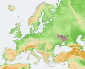 ![]() Донецький кряж на мапі України (виділено кольором, між Донецьком і Луганськом) | ||||