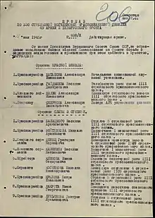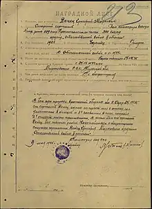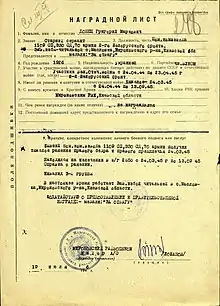 - Медаль «За перемогу над Німеччиною у Великій Вітчизняній війні 1941—1945 рр.». Посвідчення