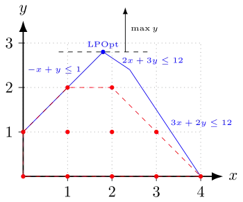 Тут допустимою множиною є сукупність пар ( x, y ), у яких значення x становить щонайменше 1 і щонайбільше 10, а значення y - принаймні 5 і не більше 12. Зауважимо, що допустима множина задачі є окремою від цільової функції, яка визначає критерій, який слід оптимізувати, і який у наведеному вище прикладі є