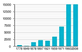 - XX століття: 1921 — 1987 чол.; 1959 — 3,5 тис. чол.; 1971 — 7,1 тис. чол.; 1991 — 14,6 тис. чол.[8]; 1993 — 15 тис. чол.[9]