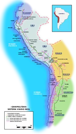 Головними були чотири дороги, що перетинали хрестом (з центром в місті Куско) всю Імперію Інків. Протяжність найдовшої дороги становила щонайменше 6600 кілометрів (1200 ліг). Дороги з'єднували всі столиці провінцій, з кожної виходило по кілька шляхів. На кожній дорозі були заїжджі двори через чітко певні відстані, самі відстані відзначалися межовими стовпами і називалися — топо або тупу.