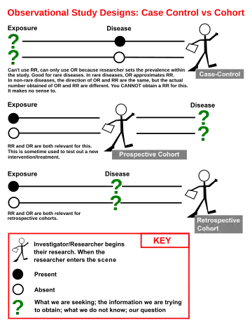 Дослідження "випадок-контроль", часто контрастує з когортними дослідженнями, де спостерігають суб'єкті, на яких діє або не діє певний чинник до тих пір, поки у них не з'явиться результат, який цікавить дослідника. [3] [4]