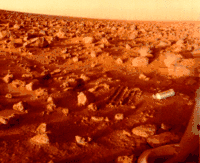 Перший контакт з поверхнею був здійснений радянськими зондами: Спускним апаратом Марс-2 — 27 листопада 1971 і апаратом Марс-3 — 2 грудня 1971. Марс-2 зазнав аварії під час спуску, а Марс-3 перестав працювати приблизно після 20 секунд після посадки.[12] Марс-6 зазнав невдачі під час приземлення, проте зумів передати деякі дані щодо атмосфери.[13] У 1975 році NASA запустила Програму «Вікінг», яка складається з двох орбітальних апаратів, обидва мали спускні апарати, вони успішно здійснили м'яку посадку 1976 року. Вікінг-1 передавав дані впродовж 6 років, Вікінг-2 — три роки. Спускні апарати Вікінг передали перші кольорові світлини Марса[14].