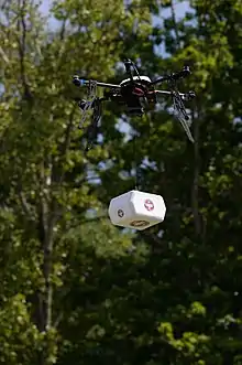 - У липні 2015 року FAA надала НАСА , компанії Flirtey і Virginia Tech, дозвіл на доставку ліки до сільської медичної клініки Вірджинії [9]. Flirtey також зробив перший повністю автономну затверджену FAA доставку в місті у березні 2016, коли нею доставлена бутильована вода, невідкладне продовольство, та комплект першої допомогі до нежилого житлового району у Hawthorne, Nevada [10].