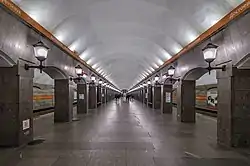 Конструкція станції —колонна трисклепінна глибокого закладення (глибина закладення — 62 м)