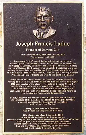 Поселення Доусон-Сіті було закладене в перші дні Клондайкської золотої лихоманки, коли Джозеф Ладу і власник магазину Артур Гарпер вирішили заснувати бізнес на старателях, що прибували на Клондайк[4][5]. Вони купили в уряду 72 га прибережної болотистої території на місці, де річка Клондайк впадає в Юкон, розбили план вулиць (які ще потрібно було забудувати) і взялися постачати дерево та інші припаси для золотошукачів[6]. Місцевих індіанців ген, що жили поблизу Доусон, канадська поліція переселила на 5 км вниз по течії Юкону, у невеличку резервацію[7].