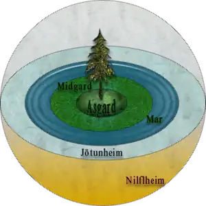 Вищезгадана міфологема «Мідґард» стала для нас відомою завдяки текстам «Едди», «Гімну Кедмона», «Ґеліанду», «Муспіллі» та іншим. Сноррі Стурлусон систематизував доступні на той час відомості та дійшов наступного висновку. Мідґард — це область в глибині суші, оточеної океаном. На її берегах боги Аси відвели землі та розселили велетнів, а в центрі, оточені захисним муром, проживали люди. Матеріалом для будівництва стіни слугували повіки першої живої істоти на Землі, велетня — Іміра. Створення світу за германськими віруваннями не вписується в концепцію «ex nihilo» (з нічого), як це притаманно християнству, а допускало паралельне існування безодні й таких об'єктів, як Ніфльгейм та Муспельгейм. За первісним віруванням германців створення світу є актом особливої організації, огородження та упорядкування простору. Характерним для цього процесу є постійний конфлікт та боротьба між первозданним хаосом та всіма елементами всесвіту. Організація простору носить чітко побудовану структуру, де посеред світу знаходиться Мідґард, в середині нього — Асґард, а в середині останнього — поле Ідаволл з капищем[30].