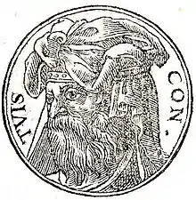 Ціо (Тіваз, Тюр, Херу, Сахснот) — все це різні варіанти імені прадавнього, ймовірно головного, бога неба германських племен[44]. Надалі, перекочувавши в скандинавську міфологію, він отримав другорядне значення й став одноруким богом меча — Тюром[1]. Ціо найстаріший зі всіх німецьких богів і за своїм значенням рівнявся грецькому Зевсу. Початково світлий бог неба за часів Тацита перетворений на бога меча та війни. З ним, схоже, сталося те ж, що з римським Марсом, який спочатку також добрий бог врожайності[45]. Як і в римлян третій день тижня присвячений Марсу так і в германців, з часом, вівторок став ототожнюватися з Ціо (Тюром) й отримав назву «Dienstag», витіснивши попередню — «ziestag/ziostag» (день Ціо)[46]. Пізніше до атрибутів цього божества додали стріли, а згодом й меч. Супутником Ціо це вовк Фенрір, якого бог щодня власноруч годував. Одного разу тварина відкусила божеству праву руку, що трапилося, коли за допомогою Ціо інші боги вирішили закувати Фенріра в кайдани[47][45]. В образі вовка передавалася сутність демона мороку. Таким чином Ціо, стосовно Фенріра, зберігає прадавні риси бога неба, який відбирає світло з темної пащі тварини. Цей епізод жертвоприношення частини тіла демонструє уявлення давніх германців про зміну дня та ночі. Останні залишки культу поклоніння Ціо знайдено у племен, що проживали південніше Балтійського моря. Сакси поклонялися божеству, що мало всі попередні риси Ціо, незабаром перетвореного на бога війни, наділеного магічним мечем та отримавшого нове ім'я — Сакснот[45].