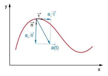 Тут перший доданок — тангенціальне прискорення, а другий — нормальне прискорення. Через позначено одиничний вектор нормалі, — радіус кривини траєкторії в даній точці, — елемент довжини траєкторії. Малу ділянку будь-якої кривої можна вважати дугою кола, причому її радіус і є радіусом кривини . У ланцюжку перетворень використано очевидні співвідношення і (де — малий кут повороту навколо центру кривини).
