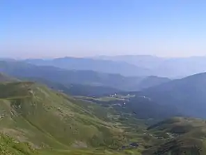 ![]() Вигляд з Близниці на Драгобратське озеро (внизу) і гірськолижний курорт Драгобрат | ||||