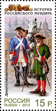 Потім драгуни стали поповнюватися московськими охочими людьми (добровольцями) і охрещеними татарами. До кінця царювання Олексія Михайловича драгунів було вже понад 11 тис. Тодішні драгуни були озброєні мушкетами, шпагами, бердишами і короткими списами. Цар Петро I при створенні кавалерії нової армії надавав перевагу саме драгунам і на кінець 1708 у Росії було 36 драгунських полків[4]. У 1707 році створюється Лейб-Регімент, у 1719 р. перейменований в Санкт-Петербурзький драгунський полк (назву Лейб-Регіменту тоді отримує полк кінної гвардії). У 1712 році створюються гарнізонні драгунські полки для несення поліційної служби, що проіснували до 1811 р.[4] Російські драгуни початку XVIII століття озброювалися фузіями з багнетами і палашами, пістолетами спочатку було забезпечено тільки половину особового складу. Для виконання фортифікаційних робіт драгунські підрозділи мали шанцевий інструмент[11]. У 1732 р. 3 драгунські полки переводяться в кірасирські. У 1763 році число драгунських полків скоротилося до 7, а їхня тактика стала чисто кавалерійською — зводилася до удару холодною зброєю без спішування[4]. За часів Катерини II драгуни стають переважно гарнізонними військами[11]. На початку XIX ст. значення драгунів як ударної кінноти зростає і на 1812 р. у Росії налічується вже 37 драгунських полків[4]. Обмундирування драгунів того часу відрізняється від кавалерійського, наближаючись до піхотного[11].