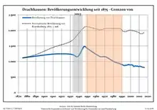 Динаміка населення з 1875 року в сучасних кордонах (Синя лінія: населення; Пунктир: відносна порівняльна динаміка населення землі Бранденбург; Сірий фон: період Третього рейху; Помаранчевий фон: період НДР)