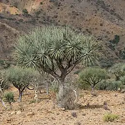 | Драцена кіноварно-червона (Dracaena cinnabari) | ![]() | Дерево до 10 м заввишки з товстим стовбуром. У молодому віці лінійно-мечоподібні листки утворюють шапку у верхній частині стовбура. Із віком з'являються розгалужені гілки. Листки довжиною до 30-60 см. Квіти з'являються в період мусонних дощів. Плід — ягода.[5] |