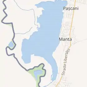 З півночі відділене від озера Манта вузькою смугою суходолу.