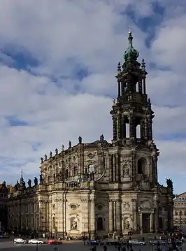 Придворна католицька Церква, що стоїть на березі Ельби в центрі «Старого міста», виділяється на тлі архітектурного ансамблю Театральної площі Дрездена своєю легкістю і витонченістю. Домінантою цього пам'ятника культури є 85,5 метрова ажурна дзвіниця, яка одночасно здається повітряно-тонкою і монументальною. Фасад Собору прикрашений сімдесяти вісьмома 3,5-метровими статуями святих, апостолів і церковних князів роботи Лоренцо Матіеллі.