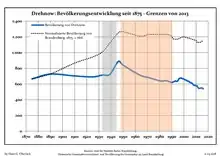 Динаміка населення з 1875 року в сучасних кордонах (Синя лінія: населення; Пунктир: відносна порівняльна динаміка населення землі Бранденбург; Сірий фон: період Третього рейху; Помаранчевий фон: період НДР)