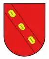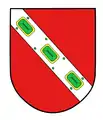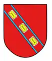 У червоному полі між двома вузькими смугами блакитного кольору перев'язь вправо; на ній три чотирикутних камені, інкрустованих золотом. Нагорі розміщенні три страусиних пір'їни.