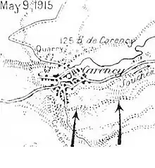 Фінальна стадія артилерійської підготовки розпочалася о 6.00 ранку 9 травня. О 8 годин французи підірвали мінні галереї та посилили обстріл першої та другої позиції німецьких військ. О 10.00 піхота перейшла в атаку й з ходу, незважаючи на високі втрати в живій силі, опанувала три перші траншеї противника.