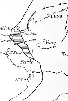 За планом наступальної операції, французи мали прорвати вузьку смужку в оборонних позиціях противника завширшки 15 км силами 10-ї армії, на напрямку головного удару шириною 10 км наступали одночасно три армійські корпуси — XVII, XX та XXXIII. Одночасно завдавалися допоміжні удари силами двох дивізій XXI корпусу на відрізі узгір'я Нотр-дам де Лорет та південніше селища Баєль-Сір-Берту. Головною метою наступу визначалося опанувати хребтом Вімі та закріпитися на ньому, щоб не допустити успішного проведення німцями контратак на цьому напрямку.