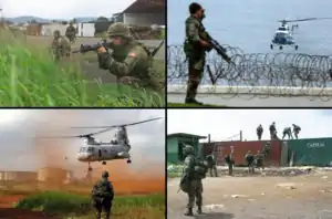 ![]() За годинниковою стрілкою з лівого верхнього кутка: Американські морпіхи охороняють Міжнародний аеропорт Робертса; Член американських військових сил спеціального призначення зустрічає гелікоптер ООН, який прибуває до посольства США у Ліберії; Морпіхи з 26-ого експедиційного загону морської піхоти охороняють Вільний порт Монровії на острові Бушрод; Американська піхота прибула до Міжнародного аеропорту Робертса на гелікоптерах CH-46 «Сі Найт». За годинниковою стрілкою з лівого верхнього кутка: Американські морпіхи охороняють Міжнародний аеропорт Робертса; Член американських військових сил спеціального призначення зустрічає гелікоптер ООН, який прибуває до посольства США у Ліберії; Морпіхи з 26-ого експедиційного загону морської піхоти охороняють Вільний порт Монровії на острові Бушрод; Американська піхота прибула до Міжнародного аеропорту Робертса на гелікоптерах CH-46 «Сі Найт». | ||||||||