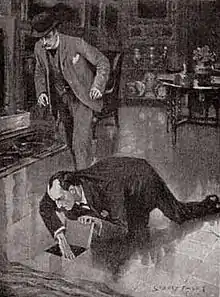 Поки Лестрейд сперечається з констеблем, Холмс знаходить під килимом порожню схованку.