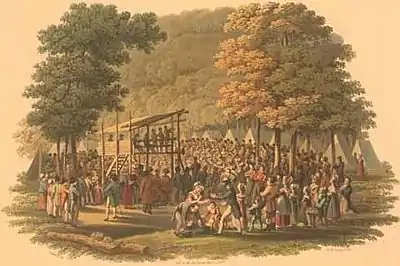 «Відродження 1800 року», що мало місце у Лоґан-каунті, штат Кентуккі, почалося як традиційні пресвітеріанські збори для служіння. Перші неформальні табірні збори відбулися тут у червні, біля ред-ріверського дому для зібрань. Схожі зібрання відбулися у сусідніх конгрегаціях, всі під керівництвом Джеймса МакҐріді. Через рік ще більші збори для служіння відбулися у Кейн-Рідж, штат Кентукі. Їх проводив Бартон Стоун, і у них взяло участь близько 20 000 осіб. Численні пресвітеріанські, баптистські та методистські служителі брали участь у богослужіннях. Завдяки Бартону Стоуну (1772-1844) та Александру Кемпбеллу (1788-1866) релігійне відродження шляхом табірних зборів стало основним шляхом розширення церкви для методистів та баптистів[16].