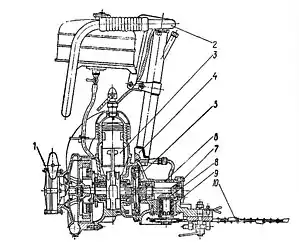 - Карбюратор — мембранного типу КМП-100А (згодом — КМП-100АР з додатковим регулювальним гвинтом холостого ходу)
