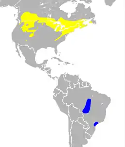 Ареал виду простягається у лісовій зоні Канади та США, від тихоокеанського узбережжя аж до атлантичного, Скелястих гір, Великих озер та верхніх Аппалачів. Взимку мігрує до центральних районів Південної Америки, головно до Бразилії.