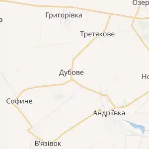 Село Дубове знаходиться на відстані 1 км від села Андріївка та за 1,5 км від сіл Третякове, Григорівка та Софине.