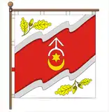 Квадратне полотнище поділене хвилястими смугами на три частини, які повторюють пропорції, кольори та елементи Герба.